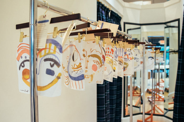 Live painting on limited-edition Ann Mashburn totes and handkerchiefs at her showroom in Atlanta, Georgia.