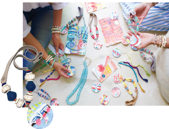 For a limited-edition collection, Sally teamed up with Charlotte-based Twine & Twig to create a line of 100 limited edition necklaces. Each necklace features a naturally shed moose antler slice, hand painted by Sally and designed by Twine & Twig using signature African trade beads.